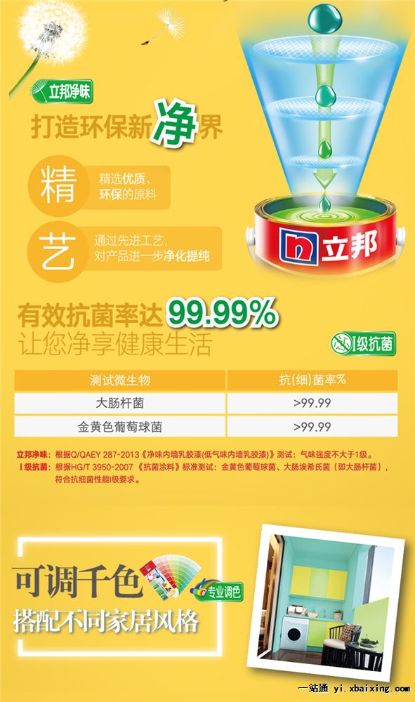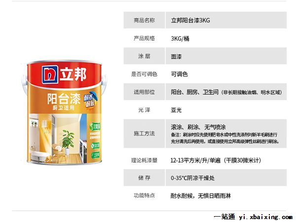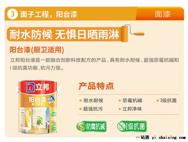 立邦阳台漆(厨卫适用)是一款专为阳台设计研发的产品,具有优异的耐水、耐候性能,兼具超强防霉抗碱和I级抗菌功能。
