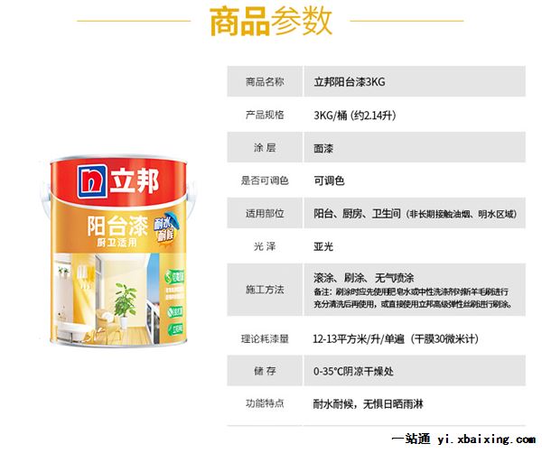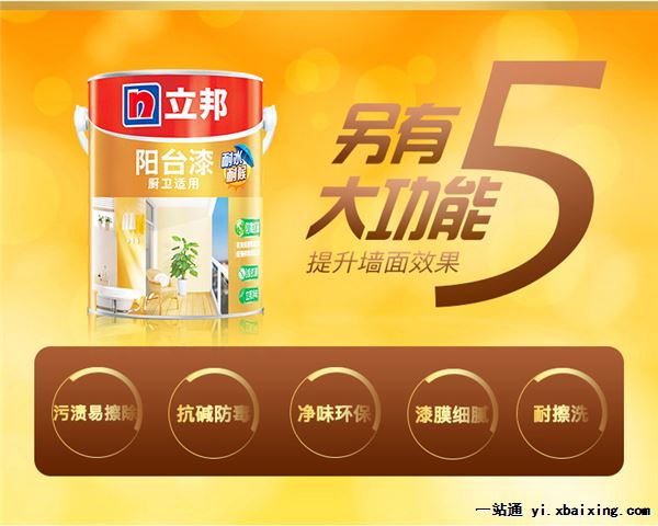 立邦阳台漆专卖 立邦郑州旗舰店 立邦阳台涂装体系专卖热线0371-86507799 立邦阳台漆使用说明: 品名:立邦阳台漆 规格:5L 光泽:亚光立邦阳台漆稀释使用前应搅拌均匀 为达到最佳涂刷效果,滚涂、刷涂时通常可加入涂料10%-20%体积的水,最多不可加超过30%体积的水稀释此产品,并搅拌均匀(可根据施工手感酌情增减) 若使用无气喷涂,可根据实际情况使用不超过立邦阳台漆10%体积的水稀释,并搅拌均匀 工具清洗涂装中途停顿及涂装完毕后,请及时使用清水清洗所有器具 施工温度请不要在潮湿或寒冷的天气(气温低于5℃,相对湿度大于85%)情况下施工,否则不能达到预期的涂装效果 请在通风良好的场所使用,如确需在密闭环境作业,必须安装通风装置及使用适当的防护装置 施工方法滚涂 刷涂 无气喷涂