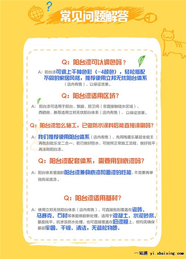 耗漆量(13-14)平方米/升/单遍(干膜30微米计) 因实际施工表面的粗糙程度和稀释比例不同,耗漆量也有所不同 重涂时间(以干膜30微米,25-30℃计) 表干:60分钟 硬干:2小时 重涂:至少间隔2-3小时 储存密闭存于0-35℃阴凉干燥处 底材处理表面处理 新建墙面:清除表面灰尘、油腻和松散泥灰,如果有孔隙及时修补,确保墙面清洁干燥和平整。 重涂墙面:铲除旧墙面不牢固的漆膜,清除表面灰尘粉化物和杂质,批平打磨,清洗并彻底干燥。 表面状态 确保预涂基材表面湿度小于10%,pH值小于10。 预涂基材表面必须牢固、干燥、清洁、平整和无松脱物质。 立邦阳台漆涂饰前,应对基层进行验收;合格后,方可进行涂饰施工。